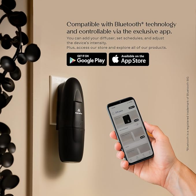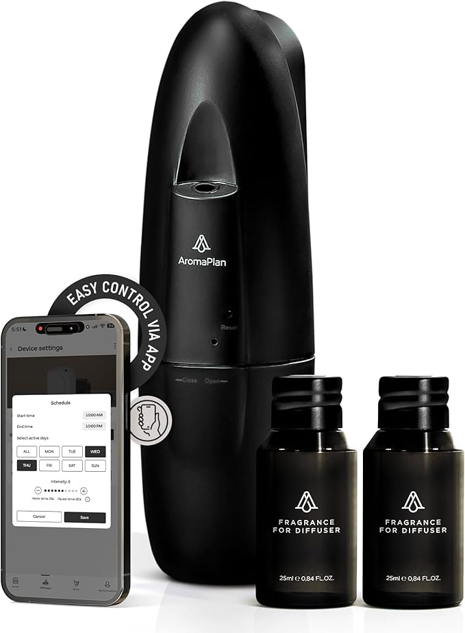 • EASY TO SET UP WITH CUSTOMIZABLE SETTINGS โ€“ This new scent diffuser is compatible with Bluetooth technology (Bluetooth is a registered trademark of Bluetooth SIG) and is controlled through the AromaPlan App, available for iOS and Android. It is possible to create multiple advanced schedules (days of operation, specific times, fog intensity, work time, and break time)