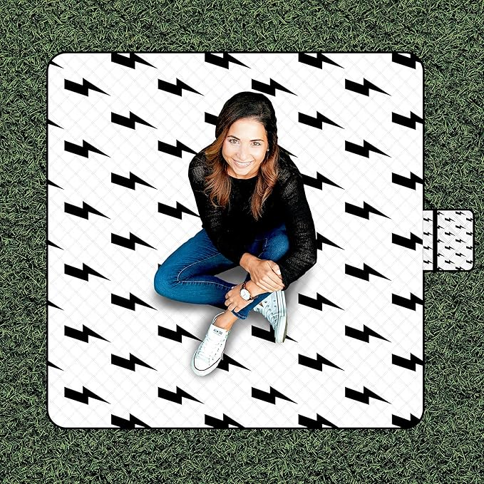 • Eye-Catching Lightning Pattern: Featuring a bold black lightning bolt design on a clean white background, this picnic blanket adds a stylish and modern flair to your outdoor setupโ€”turning heads while offering function and fun.