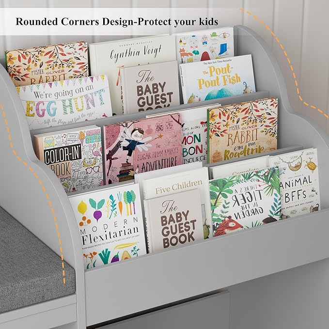 • 4-in-1 Bookshelf: This versatile masterpiece seamlessly integrates storage cubbies, a book rack, a mobile toy box, and a comfortable cushioned seat, forming an organized and joyful play area for your child while offering convenient access to books and toys to keep the space tidy