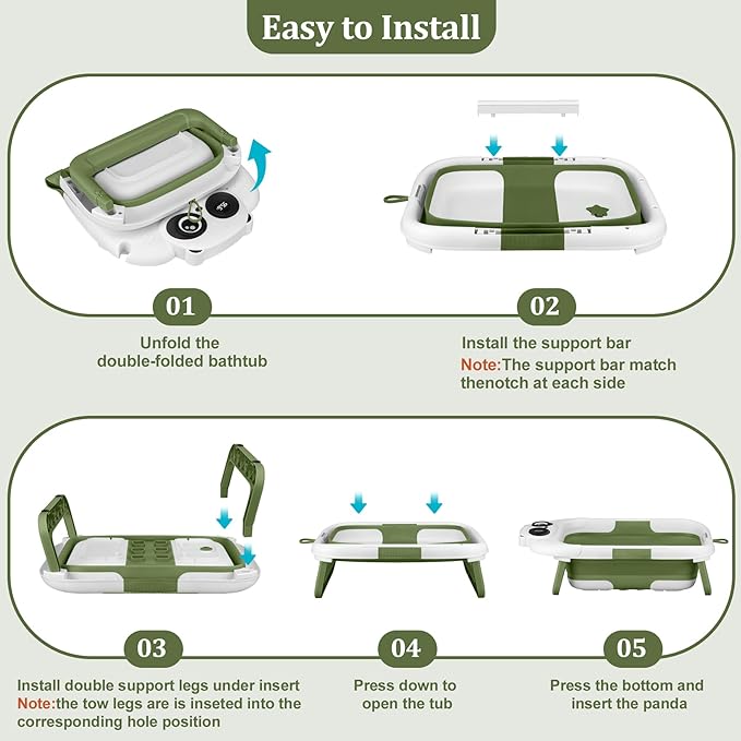 • Double-Fold & Detachable Leg Support: Our collapsible baby bathtub features an ingenious double-fold design, it even folds in half, folding the body into a square with a thickness of 4 inches. Convenient for storage and saving space!