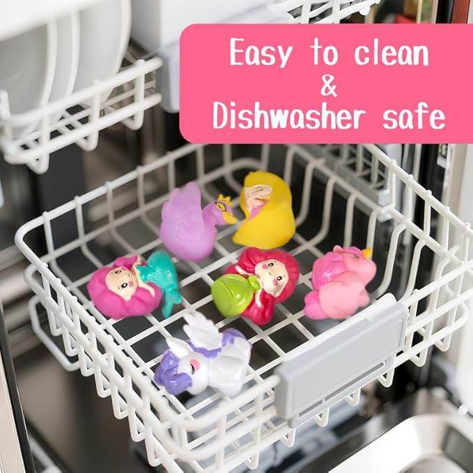 • 8 PCS Princess Bath Toys : Get everything for splashy fun & easy cleanup! Enjoy 6 bright color, sealed bath toys, a easy-grip fishing net(perfect for little hands!), and a bunny-shape bath storage bag with drain holes & strong suction cups. All designed for a hygienic playtime! Say goodbye to bath time battles - hello to joyful splash time!