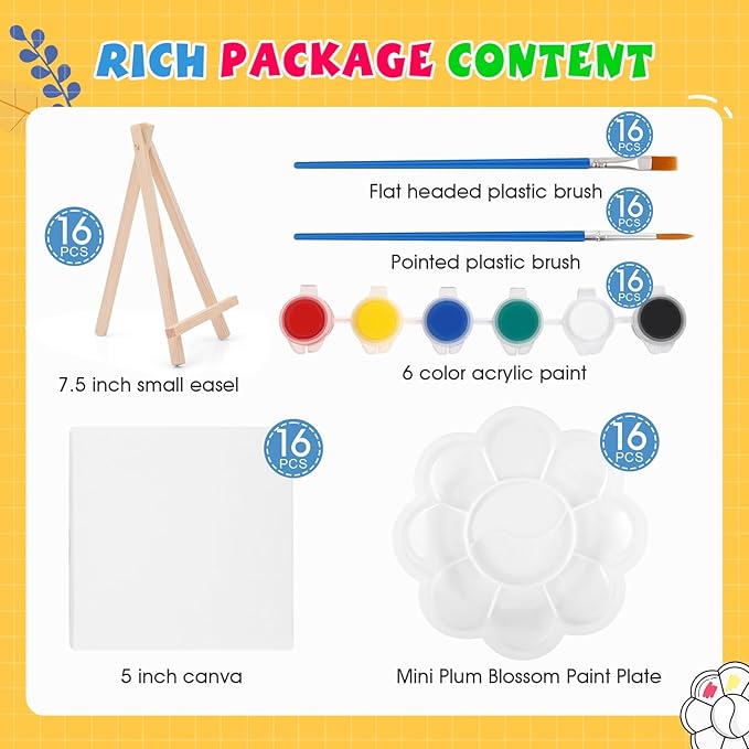 • 【Multi group art set】: 16 Set small acrylic painting kit have 16 mini stretched canvas (5*5 inch), 16 wooden mini easels (7.5 inch), 16 acrylic paint strips,16 flat paint brushes, 16 round pointed brushes and 16 plastic art plates. One set contains all, very suitable for kids, adults, art workshops, paint classes, art nights, valentines painting gifts, and paint parties.