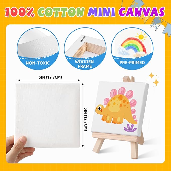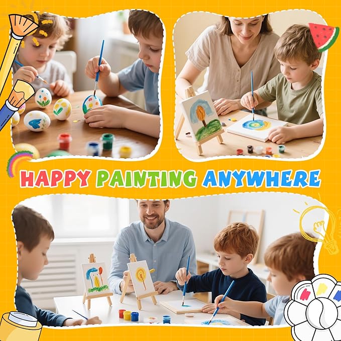 • 【 Mini stretched canvas and easel】: The 16 set mini acrylic paint set provide 5 x 5 inch small canvas with 7.5 inch mini wooden display easel. Kids can show their creations anywhere. Our mini canvas are safe and non-toxic, making them perfect for kids to use. These small easels are sturdy,can be used to hold photos, phones and more.