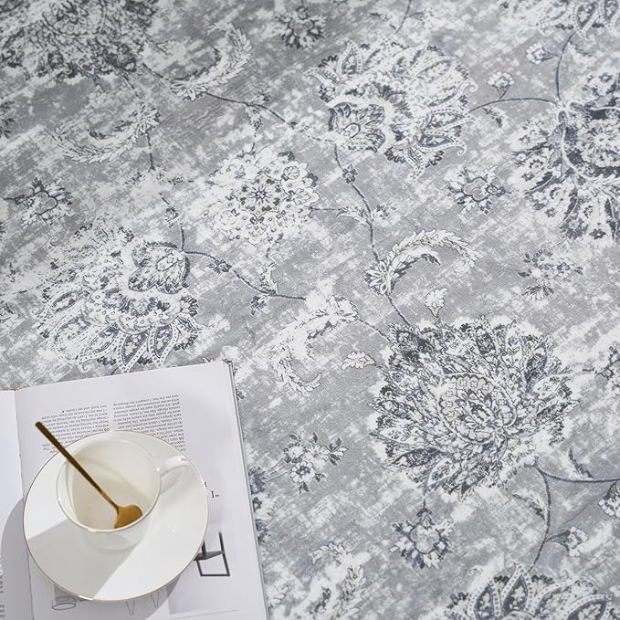 jinchan Round Rug 4ft Area Rug - Indoor Vintage Hallway Circle 4' Washable - Ultra-Thin Low Pile Soft Small Non Slip Distressed Floral Print for Living Room Dining Room Bedroom Entryway Grey