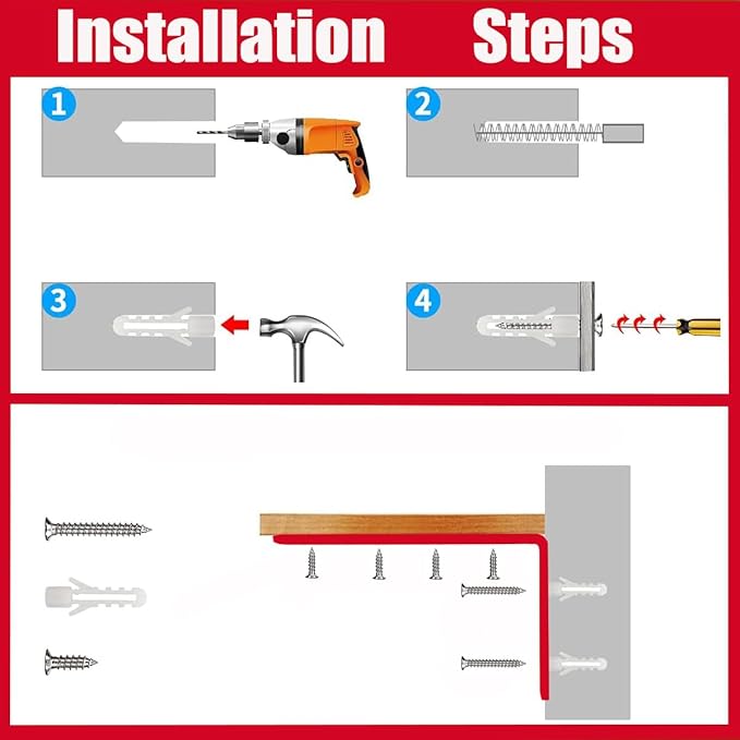 • Package Includes๏ผˆfurniture anchors for baby proofing๏ผ‰: Furniture anchors Use the hardware components included in the package, and baby furniture anchor Package Includes๏ผšAll parts made of high quality steel, includes4 pack Stainless steel bracket, 8 pcs Long wall screws, and 16 pcs Wall anchors 8pack expansion nails plugs y to install with a screwdriver or drill driver.