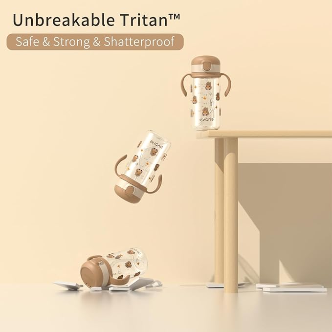 Evorie Tritan Spill Proof Toddler Straw Sippy Cup, 10 oz for Baby and Toddlers 1-3 Years Old, No Spill Straw Water Bottle with Removable Handles, Ideal for School, BPA-Free, Choco Car (NEW)