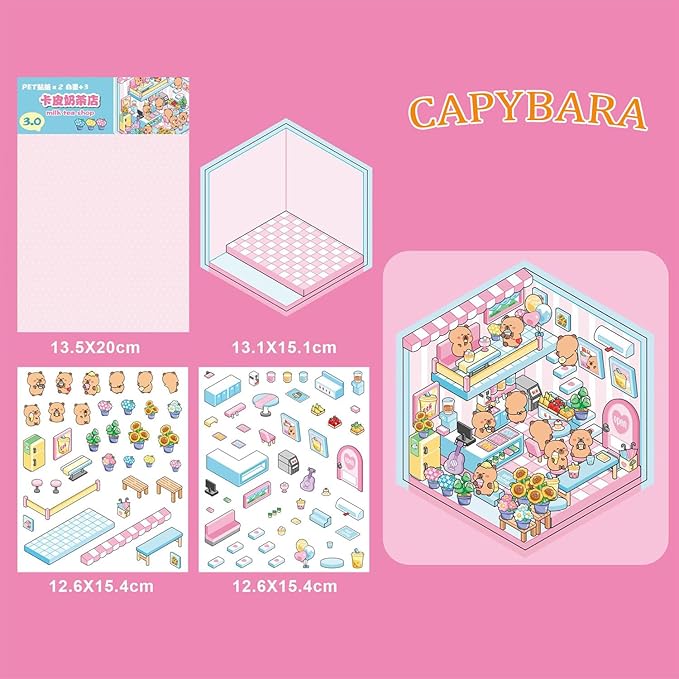 • Create Your Dream Mini Worlds: Craft 4 unique DIY 3D sticker scenes, including charming mini rooms and a delightful miniature supermarket, to build your own warm and whimsical home environment.