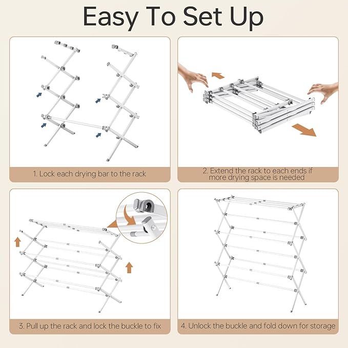 • Easy Assembly - The small laundry drying rack is super easy to put together. Just snap each bar into place and snap the end piece in on top tier for locking