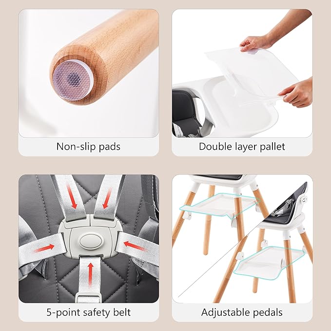 • Eco-Friendly & Safe Material: our baby high chairs are made of food-grade PP and PE to ensure that your baby's health is not affected. The baby highchair's legs are made of thick beech wood with non-slip feet.