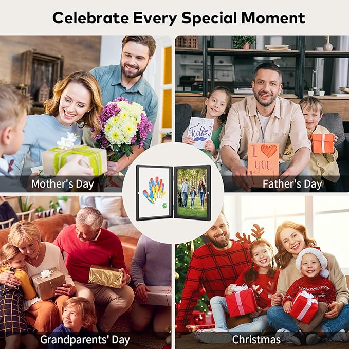• DUAL DISPLAY MODES & PHOTO AREA: Our upgraded keepsake frame also have a photo frame feature, the photo side is big enough to hold one large photo or several smaller ones. Imagine this framed treasure on your living room wall: your toddler's tiny hand nestled in yours, surrounded by family photos that spark conversations for generations