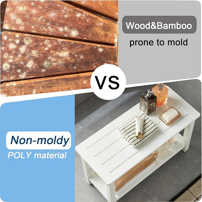 • 【Anti-mil-dew Material】Our shower bench seat is made of HDPS (polystyrene) with 304 stainless screws which never gets rust, this material is not easy to get m-o-l-d, rotting or crack after prolonged exposure to humidity, no splinters and no maintenance, 30 x 13 x 18 Inches enough large to sit (THE MOST IMPORTANT IS NO MAINTENANCE)