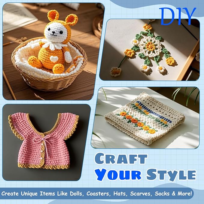 • 🌈【DESIGNED FOR TOTAL BEGINNERS】Learn crochet from scratch with confidence! This kit includes soft yarn, a full hook range, and visual step-by-step guides—perfect for first-time crafters exploring scarves, toys, or blankets.