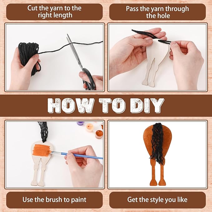 • 24 Set Wooden Horse Cutout Kit: unleash your imagination with this complete wooden horse craft kit; It includes 24 unfinished horse cutouts, 2 sets 12 color paints, 4 paintbrushes, 8 rolls of yarn in different colors, ready to be transformed by your creativity