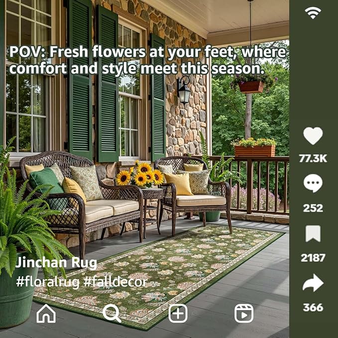 jinchan 2x5 Floral Runner Rug for Hallway Washable Kitchen Runner Vintage Romance Design Non Slip Thin Indoor Floor Cover Low-Profile Throw Carpet for Entryway Bathroom Bedroom Porch, Green