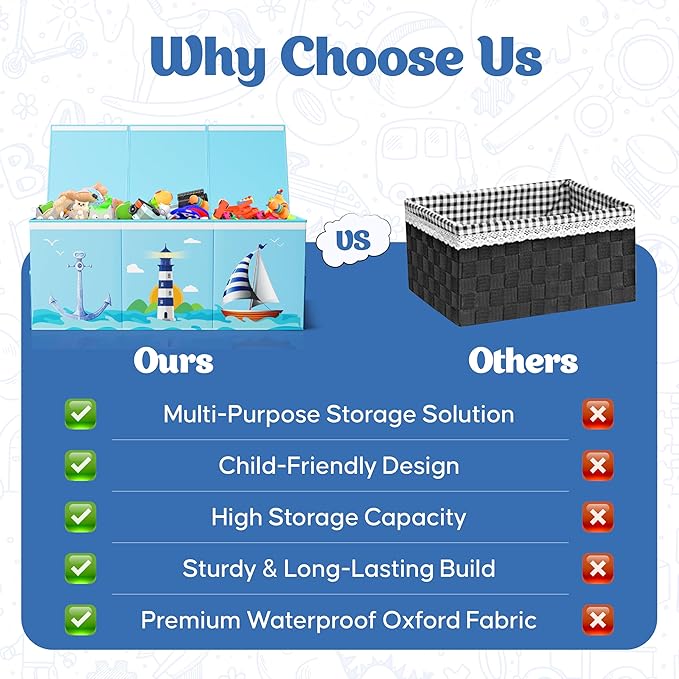 • Collapsible & Detachable Design Large Toy Basket: Our toy storage box is very easy to assemble and disassemble, equipped with 3 lids and 2 removable dividers, which can achieve 1 large box, 2 boxes or 3 boxes. Velcro design makes toy basket easy to open and seal, and toybox can be folded for storage when not in use to save space
