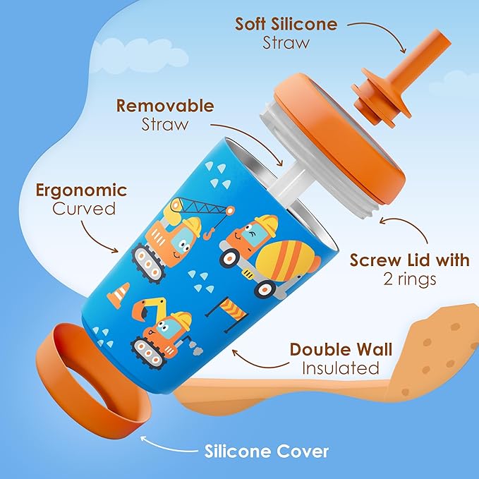 Kid Insulated Stainless Steel Tumbler with Silicone Straw, 12oz Sippy Cup for Kids (Construction Trucks)