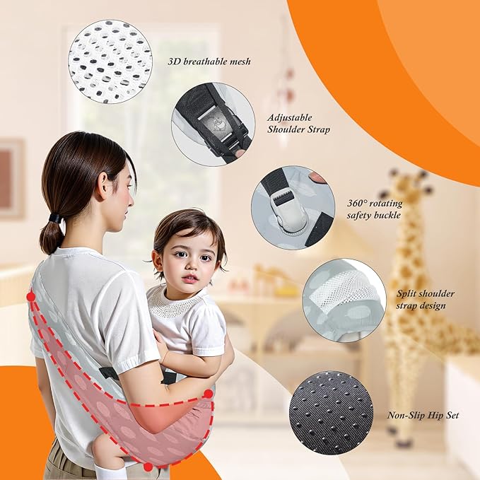 • 360°Safety and Double Protection:Equipped with a 6cm mountaineering-grade 360° rotating safety buckle and made of 600D high-density Oxford cloth, this baby carrier sling is slip-resistant and extra durable. The 10cm anti-slip safety rope provides additional protection, ensuring your child’s safety, making it an ideal toddler hip carrier for both everyday and outdoor use.