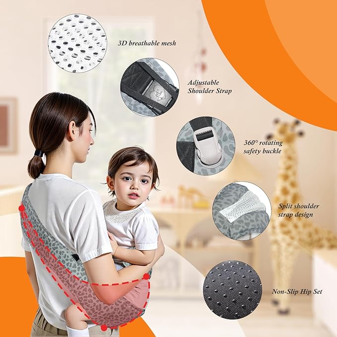 • 360°Safety and Double Protection:Equipped with a 6cm mountaineering-grade 360° rotating safety buckle and made of 600D high-density Oxford cloth, this baby carrier sling is slip-resistant and extra durable. The 10cm anti-slip safety rope provides additional protection, ensuring your child’s safety, making it an ideal toddler hip carrier for both everyday and outdoor use.