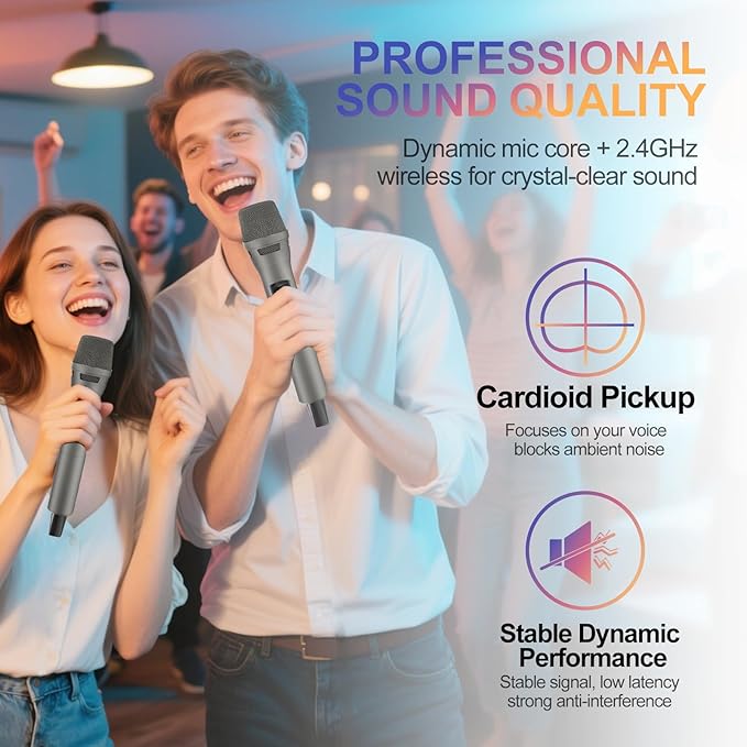 • 🎤 CRYSTAL-CLEAR, PROFESSIONAL SOUND - Unleash your inner star! Equipped with a professional dynamic mic core and advanced DSP noise cancellation, our wireless microphone delivers stunning, high-fidelity vocals. It faithfully captures every note and word, free from annoying distortion, static, or delay—perfect for karaoke, streaming, and commanding the stage at weddings and events.