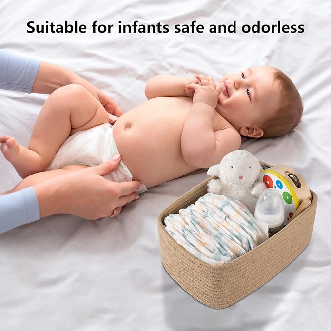• [Premium Cotton Material]:Our cute baby storage baskets are made of high quality cotton hand-woven by workers, soft and odorless, no sharp edges and corners, very friendly to babies and pets, a good choice for baby-sitting baskets and dog or cat toy baskets