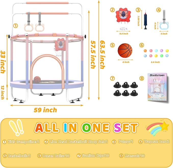 • 【4-in-1 Multi-Purpose Play Area 】Transform your backyard or game room! The indoor trampoline for kids 2-5 includes a basketball hoop, gymnastic bars, hoops and ocean balls. Kids can jump, climb or imagine adventures in their own private bounce house that will keep them active and entertained for hours.