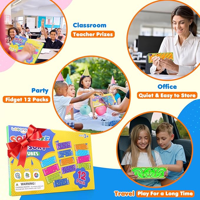 • Fidget Toys for Kids &Adults โ€“ Fun Stress Relief at School, Home, or Office, Meetings. These brightly colored fidget toys offer engaging tactile play that helps stay focused and regulate emotions. Perfect for classroom must-haves, calm-down corners, at-home learning environments, for beating boredom, quick stress relief during meetings, or desk-bound tasks, staying in church, or calming nerves on the go. The quiet maze squishy design keeps hands busy while reducing overstimulation and anxiety