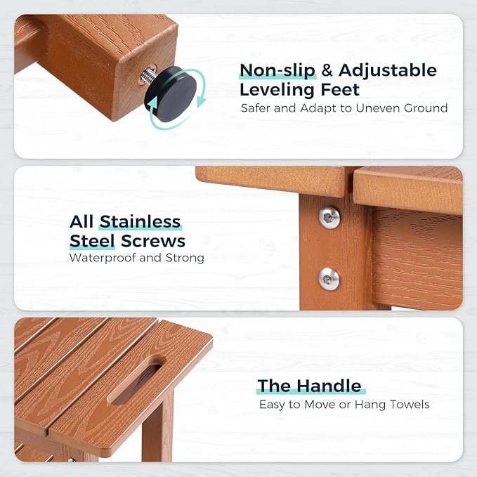 • 【100% Waterproof】 The shower bench is made of HIPS (poly lumber), with 304 stainless screws, which is highly water proof, never rot and moldy. Easy to clean, just wipe it with a towel.