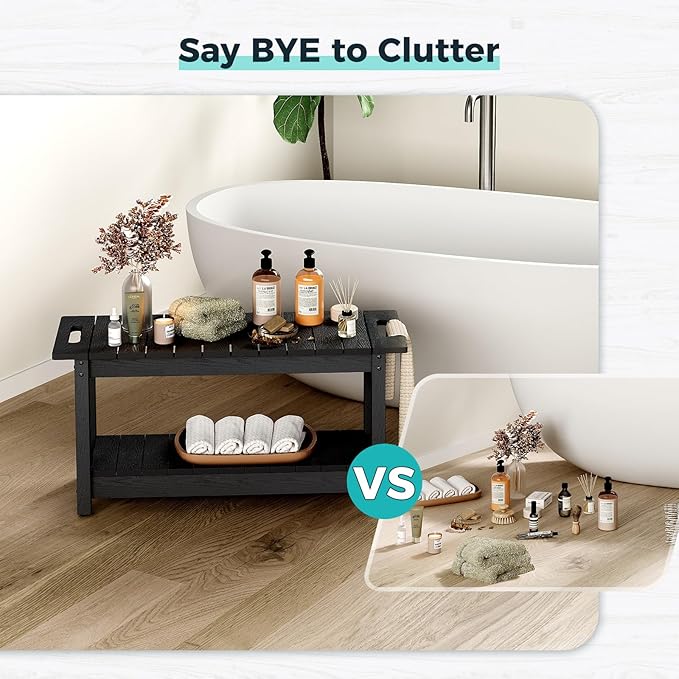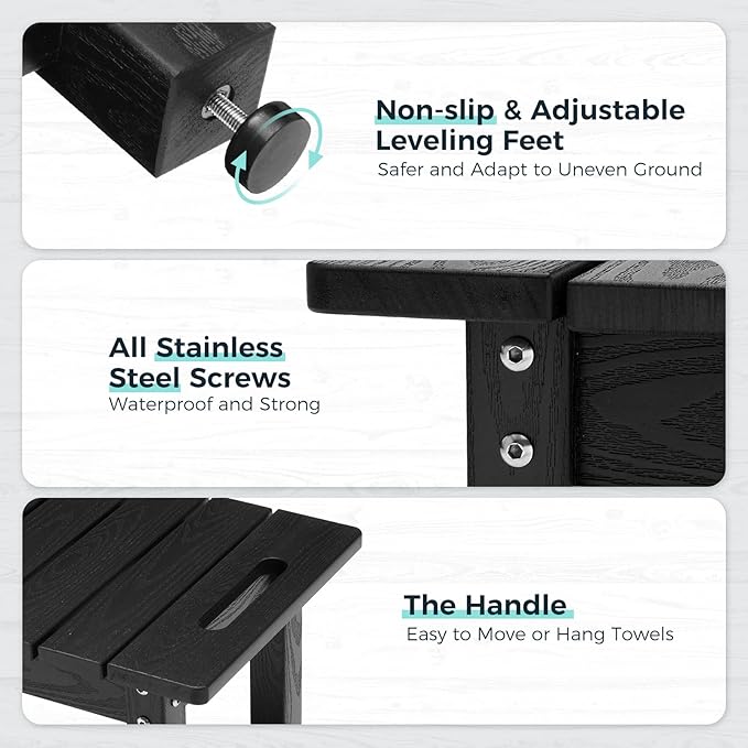 • 【100% Waterproof】 The shower bench is made of HIPS (poly lumber), with 304 stainless screws, which is highly water proof, never rot and moldy. Easy to clean, just wipe it with a towel.