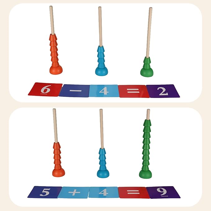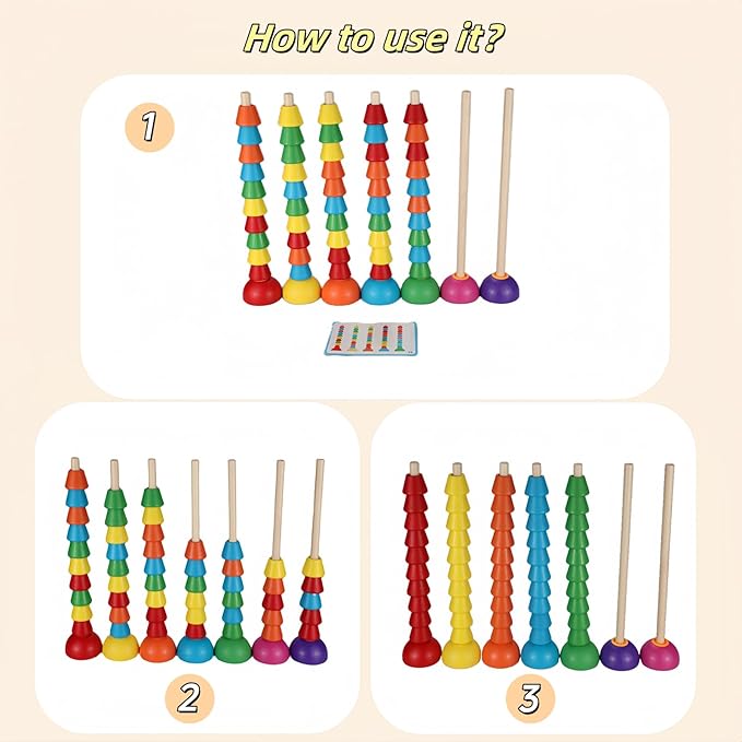 • Fine movements: Children need to accurately put rings of different colors and sizes on the pillars to exercise fine hand movements and hand-eye coordination.
