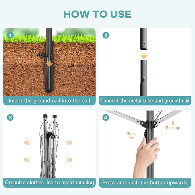 • Easy Ground Installation: Securely anchor this outdoor drying rack with the durable ground stake system, the deep-rooted stake and anti-tilt base prevent wobbling, perfect for lawns, patios, or gardens. Easily assemble in minutes.