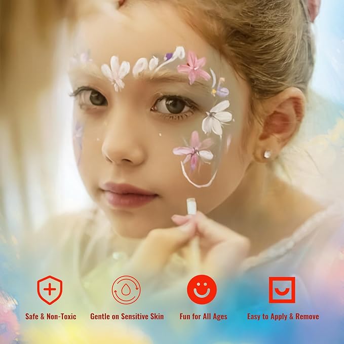 • Kid-Friendly & Safe for Sensitive Skin - Formulated with gentle, water-based ingredients, our face paint is non-toxic, paraben-free, and cruelty-free, making it safe for both kids and adults. Perfect for sensitive skin. Please perform a patch test behind the ear before use, as skin sensitivity may vary.