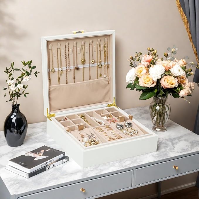 • [Exceptional Storage Capacity​​] This jewelry box features a smart 2-layer design with a top flip-top compartment and a bottom pull-out drawer, offering ample space to organize and store all your precious accessories, including rings, earrings, bracelets, watches, and more,Its medium - sized design, measuring 9.52 inches in length, 7.36 inches in width, and 3.5 inches in height,fits perfectly on any dressing table or bedside cabinet, making it a stylish and practical addition to your personal space