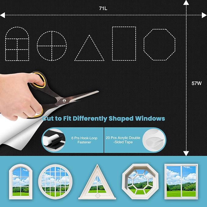 • 【DIY Shape】: Our temporary blackout shades are highly versatile and can be customized to fit any indoor window shape or size, including common types such as bay windows, skylights, door windows and so on. Remember to cut it a little larger than the window for better blackout effect.