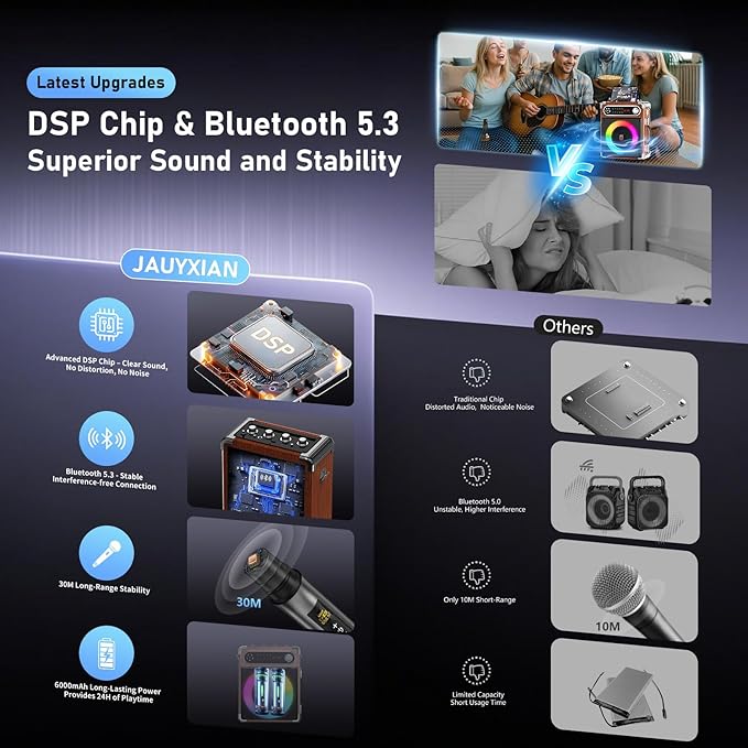 • 【Ultra-high-definition Stereo Sound Quality】: This Upgraded Karaoke Speaker is equipped with high-performance audio drivers and an advanced digital signal processor. Even at relatively high volumes, it can deliver clearer sound quality, more powerful bass, and balanced volume without distortion. The built-in 6.5" subwoofer and 2" tweeter can amplify your voice, play the radio, and stream music, providing you with a high-quality audio experience free of noise.