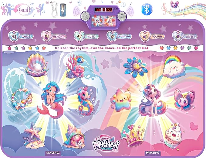 • Spacious & Dreamy Dual-Dance Zones: The largest dance mat (150×90 cm) features dual fantasy themes—Unicorn Dreamland & Mermaid Ocean City—with 12 keys shaped as stars, rainbows, ice cream, butterflies, and sea creatures. Its extra-large width fits 2-3 players for dance battles challenge or band performances, suitable for ages 3+ to adults.