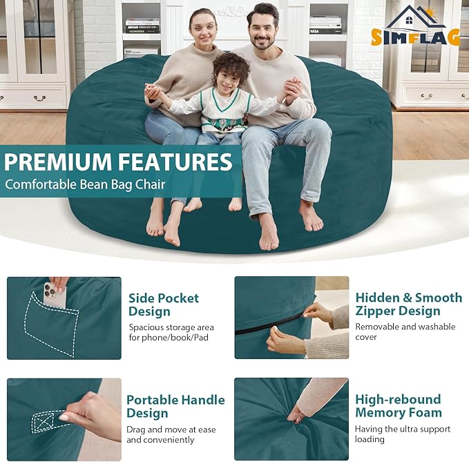 • CONVENIENT DESIGN: SIMFLAG bean bag sofa design with 4 thoughtful details, firstly, a pull-tab makes the bean bag chair easy to move around and manipulate. Second, an inter linner can contains the bean bag and allows you to wash the outside cover without spilling the beans. Third, a medium-sized pocket for your stuff. Fourth, a hidden zipper can prevent scratches to a people's delicate skin.