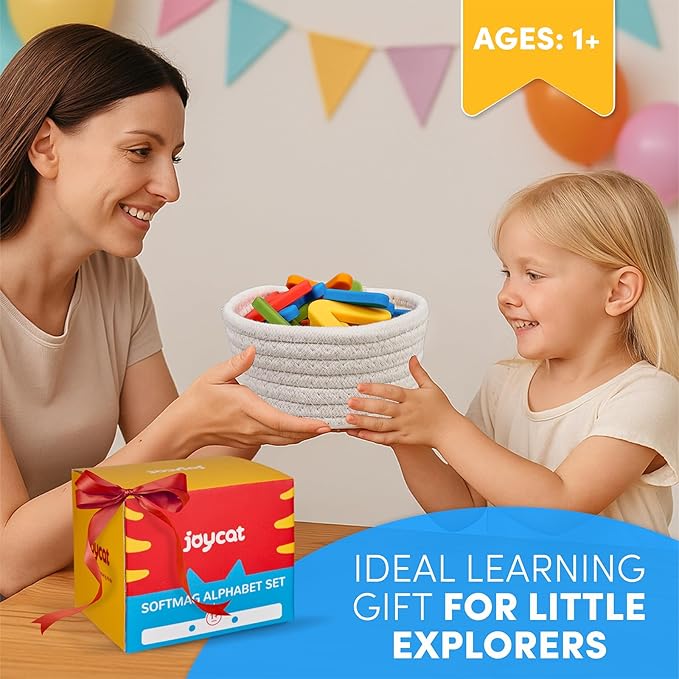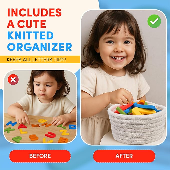 • What's in it: This silicone alphabet set includes 26 chunky letters (A-Z) in 5 high-contrast colors, housed in a reusable cotton-linen storage box. Each silicone letter features embedded magnets for reliable adhesion to refrigerators or whiteboards. Sized for small hands to explore letter shapes