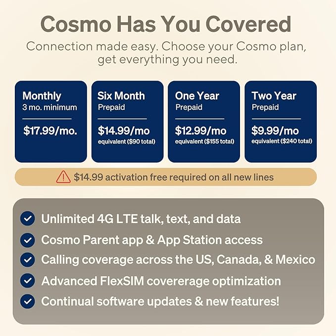 • SECURE CALLING & MESSAGING –– Get the best kid-safe connection with Cosmo. Reliable family-safe calling coverage across the US, Canada, and Mexico. With Cosmo's True Texting, securely share text, pictures, audio, and even short video messages with parent-approved contacts to bring everyone closer together.