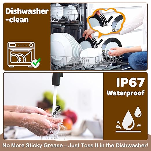 • High-Heat & Waterproof Probes: The stainless steel probes are engineered to withstand extreme temperatures up to 300ยฐC (572ยฐF), ideal for high-heat grilling and smoking. The thermometer for cooking can accurately monitor meat temperatures up to 100ยฐC (212ยฐF), with a precision of +/-1ยฐC. The IP67 waterproof rating means that the probe can be rinsed under running water or cleaned using a dishwasher, ensuring durability and hygiene