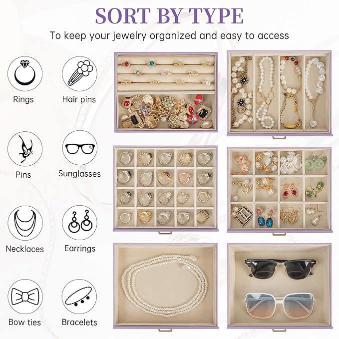 • 【LARGE CAPACITY】With 6 versatile pull out drawers, this huge jewelry box can store a lot of jewelry accessories, such as rings, earrings, necklaces, chains, bracelets, and so on. One deeper drawer is designed for large jewelries