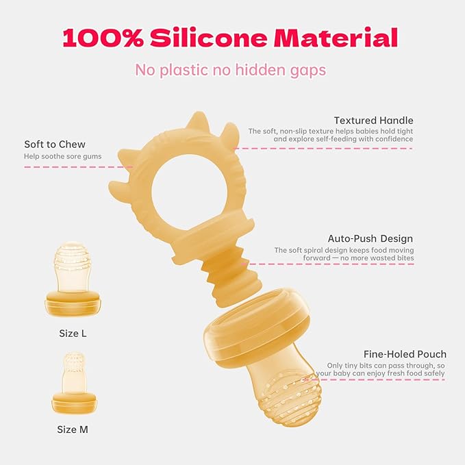 • [Easy to Clean] Thanks to Lori from our product team (and mom of two), this silicone feeder has an extremely simple structure. It has no complicated parts and can be completely disassembled, meaning there’s no place for food residues to hide. After each use, hand wash with warm, soapy water, or just let the dishwasher do it for you. Simple and quick!