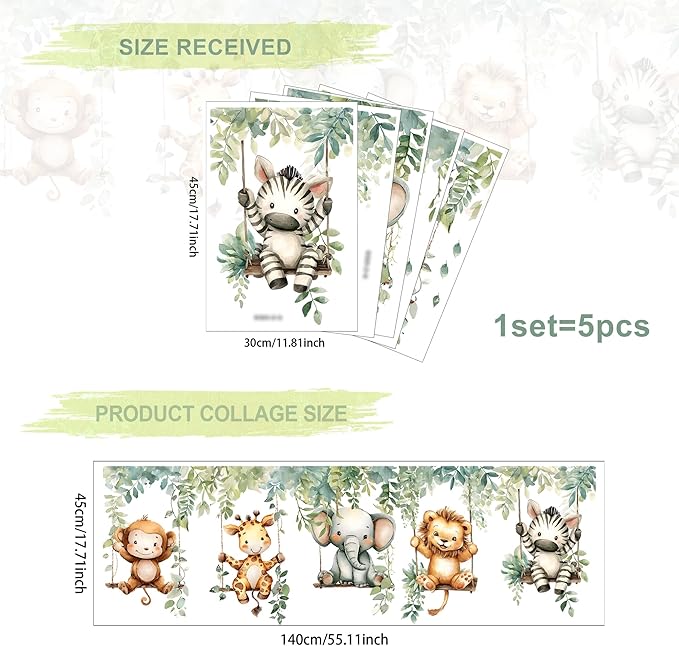 • 【What You’ll Get】 – Each set includes 5 good-quality vinyl sheets measuring(17.71" x 11.81"). This set of cute animal stickers includes 5 playful animals swinging on a green vine. Made of durable, waterproof, vinyl, these decals are safe for children and built to last.