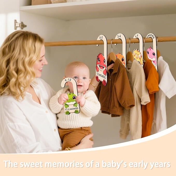 • 【What's Included】 This set of wooden baby closet organizers includes 8 sturdy dividers, each featuring a different dinosaur illustration. They cover essential growth stages: newborns, 0-3 months, 3-6 months, 6-9 months, 9-12 months, 12-18 months, 18-24 months, and toddler. As your baby grows, sorting clothes by age makes daily access and care much smoother