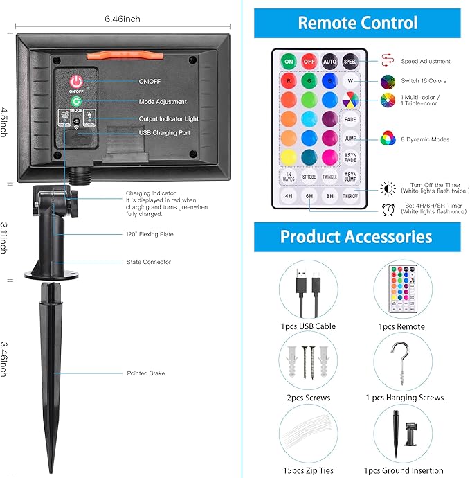 • Large Solar Panel & USB Rechargeable: Built-in a 2400mAh battery and a large-size solar panel, the RGB outdoor rope lights can work up to 10-12 hours when fully charged. Besides, the panel is equipped with a USB charging port to charge the solar panel when in bad weather. Charging time: 8 hours of direct sunlight or 5 hours via USB. The 120ยฐadjustable design of the solar panel allows you to position the panel for direct sunlight. Search ASIN: "B0CZLQP6WN" for rope lights clips