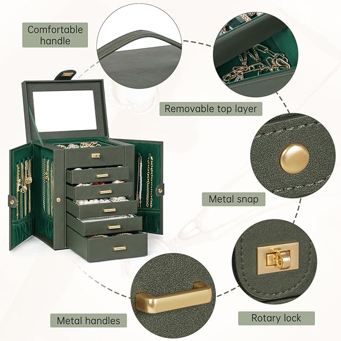 • Large Mirror Grab-and-Go Handle, This mirrored jewelry box comes with a built-in large mirror on top lid, making it easier to dress yourself. The lid has a ribbon attached to keep it from falling back. With a grab-and-go handle, convenient to carry around; delicate buckle for one-hand easy opening, easy to use and saving your time