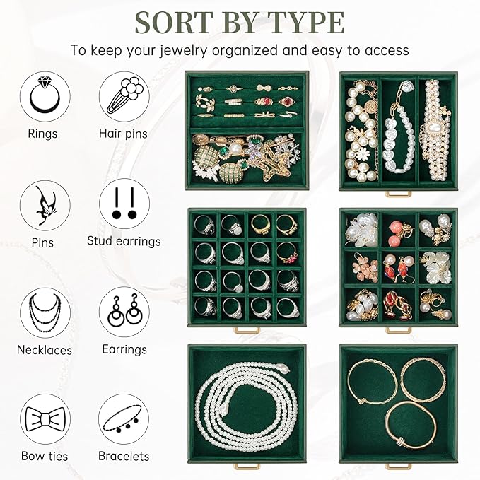 • LARGE CAPACITY, With 6 versatile pull out drawers, this black jewelry box can store a lot of jewelry accessories, such as rings, earrings, necklaces, chains, bracelets, and so on. Soft pillows in the bottom drawer suit for storing watches. One deeper drawer is designed for sunglasses or large jewelries