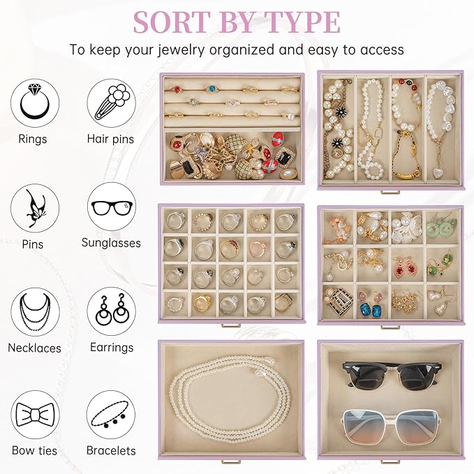 • LARGE CAPACITY:With 6 versatile pull out drawers, this huge jewelry box can store a lot of jewelry accessories, such as rings, earrings, necklaces, chains, bracelets, and so on. One deeper drawer is designed for sunglasses or large jewelries.