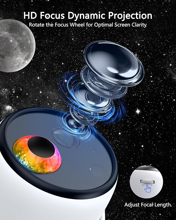 • Flexible Projection & Focus: Equipped with a high-definition lens, our galaxy night light projector delivers sharp images within 3–5 meters. Adjust the 180° angle and focus wheel to display dynamic scenes on ceilings, walls—creating a personal planetarium in seconds