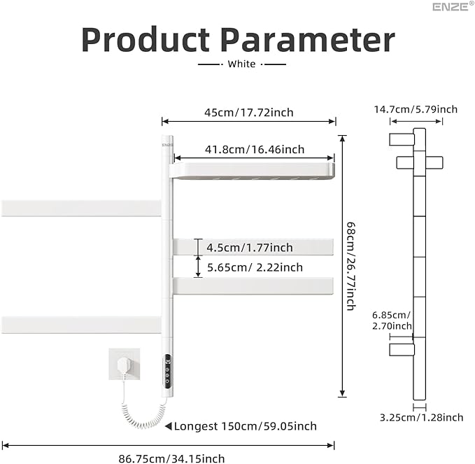 • 【180° Rotating Arms with Optional Shelf】 The towel dryer rack features four 180° rotating arms to hang multiple towels efficiently, ideal for towel warmers for bathroom small space. Choose models with or without a practical shelf for extra storage.