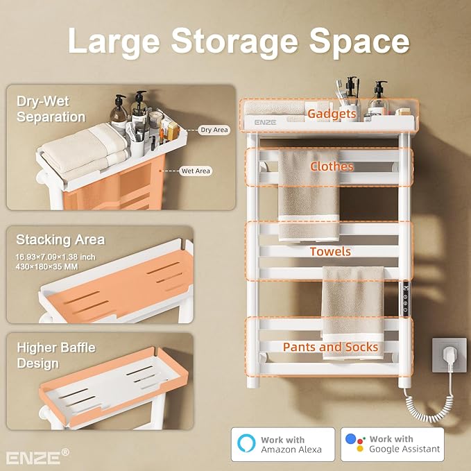 ENZE Heated Towel Rack with Shelf and Wi-Fi App Control, 8 Bars Electric Wall Mounted Towel Warmer with Timer & Adjustable Temperature, Low Carbon Steel, Plug-in/Hardwired, White